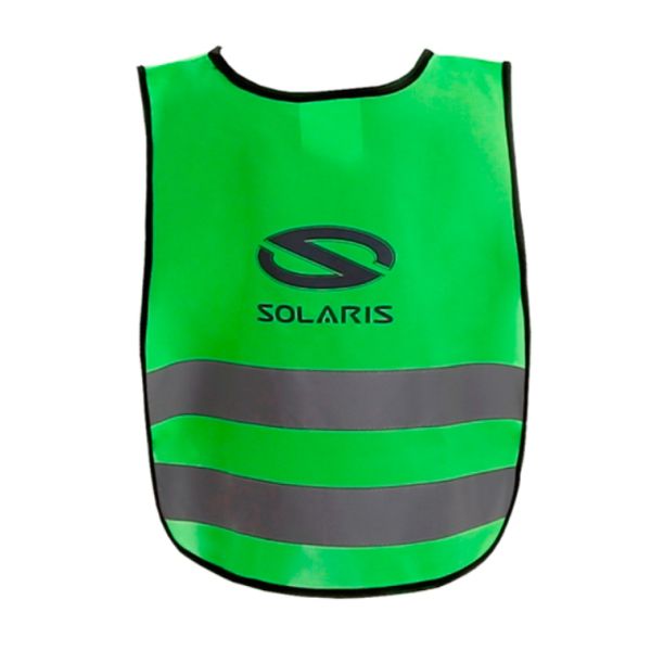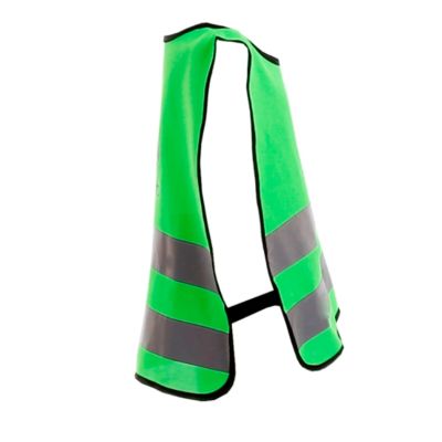 Kamizelka w zielonym kolorze, zwiększająca widoczność i bezpieczeństwo dzieci poruszających się po drodze. Charakterystyczne cechy to dwa odblaskowe pasy 5 cm wykonane ze srebrnej tkaniny zgodnej z normą EN471, obszycie czarną lamówką, wygodne zapięcie na dwa boczne rzepy z regulacją. Zakładana przez głowę.