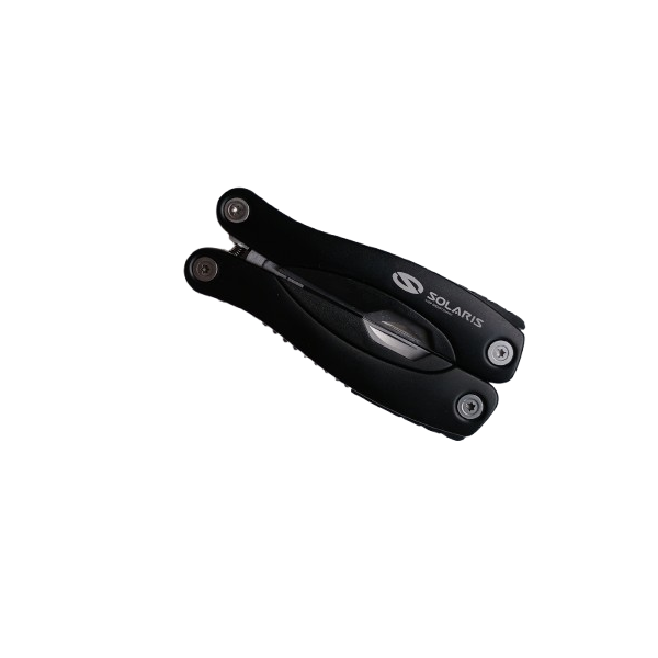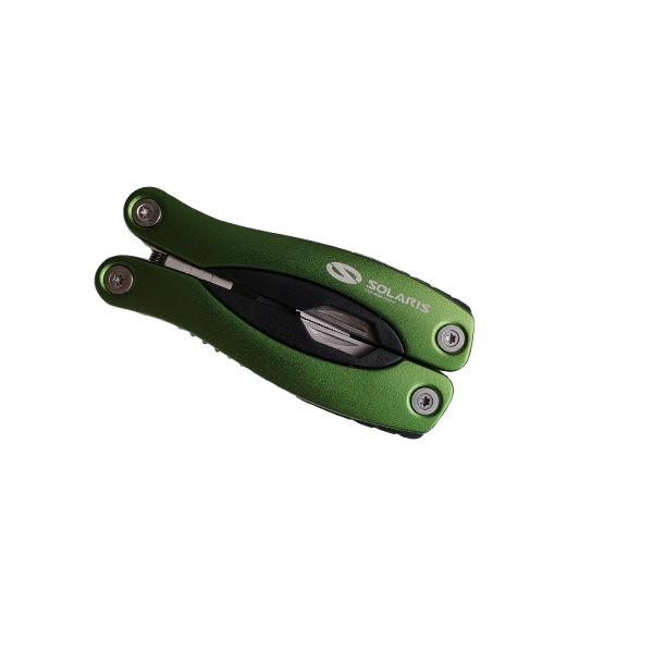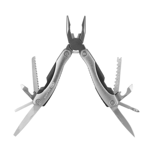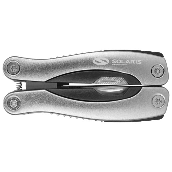 Narzędzie wielofunkcyjne wykonane ze stali nierdzewnej w aluminiowej obudowie. 10 funkcji - kombinerki, piła, nóż, pilnik, 2 wkrętaki, miarka, otwieracz do konserw, dziadek do orzechów, otwieracz do butelek. Pakowane w poliestrowe, praktyczne etui.