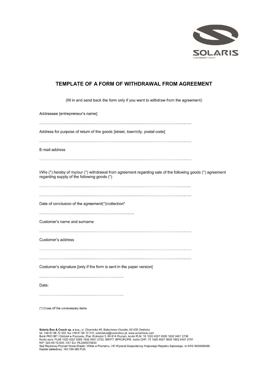 listownie na adres: Solaris Bus & Coach sp. z o.o., ul. Obornicka 46, Bolechowo-Osiedle, 62-005 Owińska,
